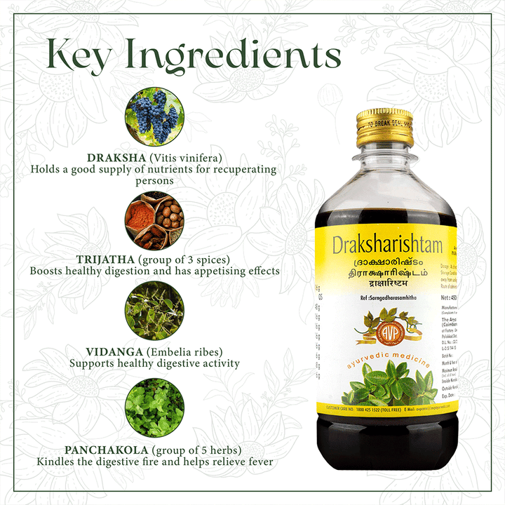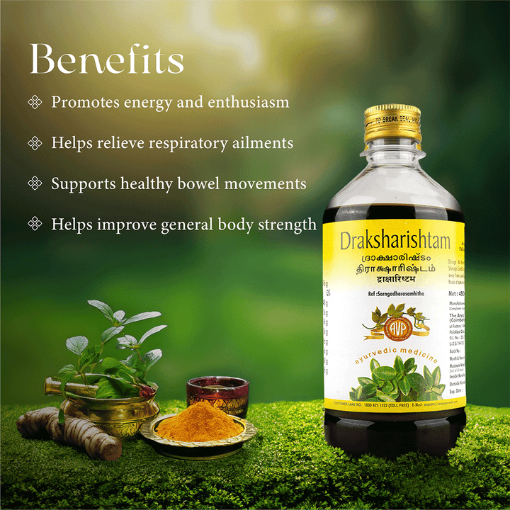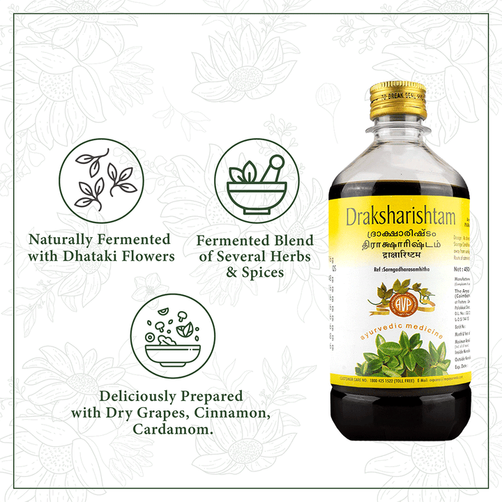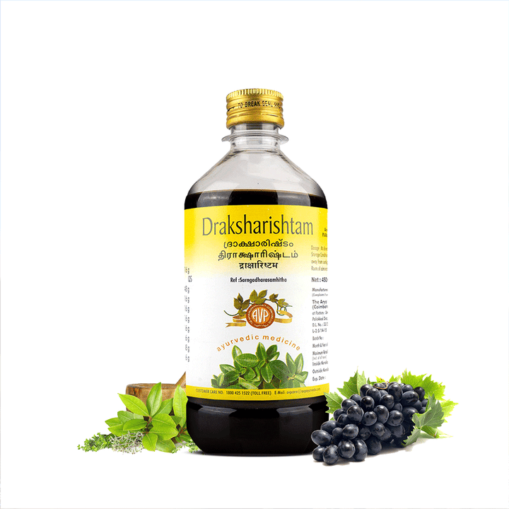 AVP Draksharishtam contains a nutritious blend of herbs and spices such as Dry grapes, Cinnamon, Cardamom, Pepper, Embelia fruit etc. that helps with optimum digestion and wellbeing.