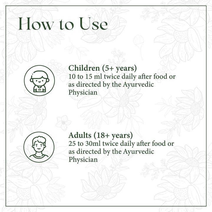 25 to 30 ml twice daily after food or as directed by the Ayurvedic Physician