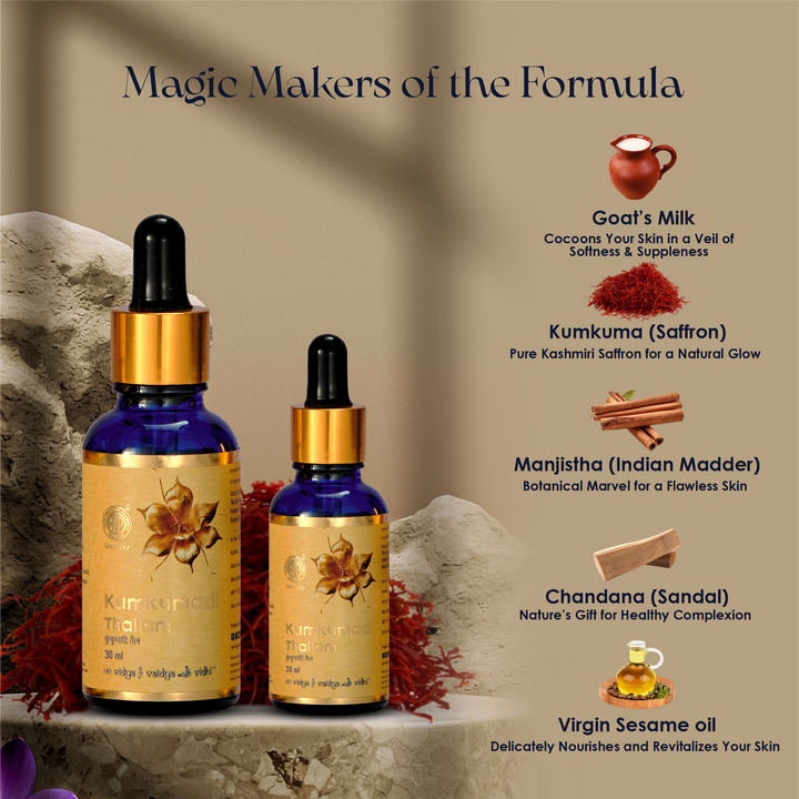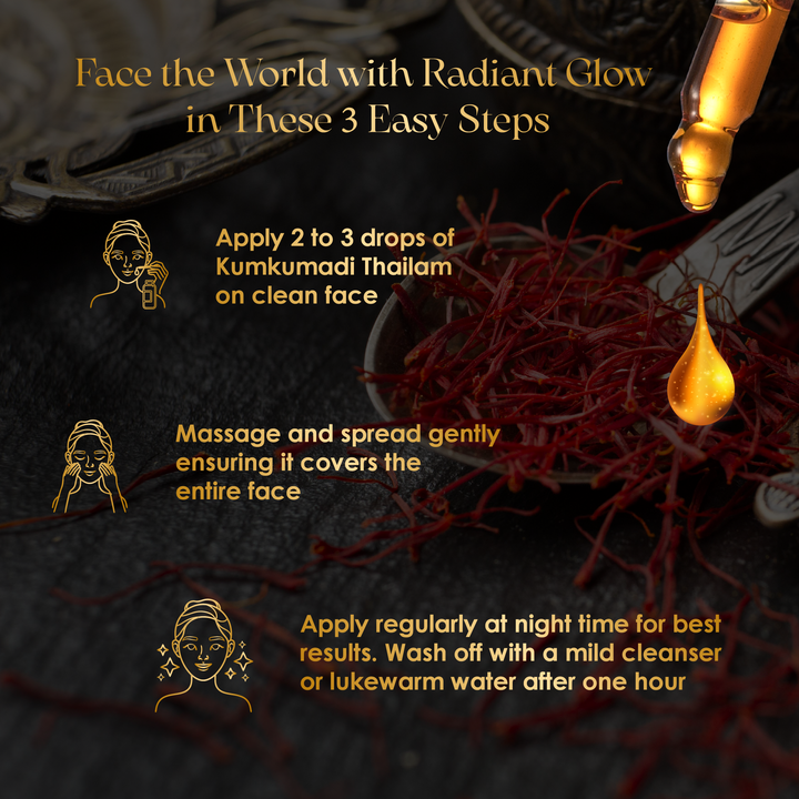 Imagine the joy of waking up to a flawless complexion, where imperfections and uneven skin tone are mere memories. Brought to life with an artisan's touch, our luxurious Kumkumadi is a testament to the enduring power of Ayurveda and the profound beauty it holds, waiting for those who seek it.