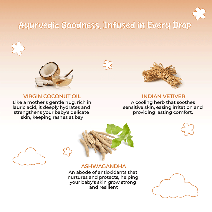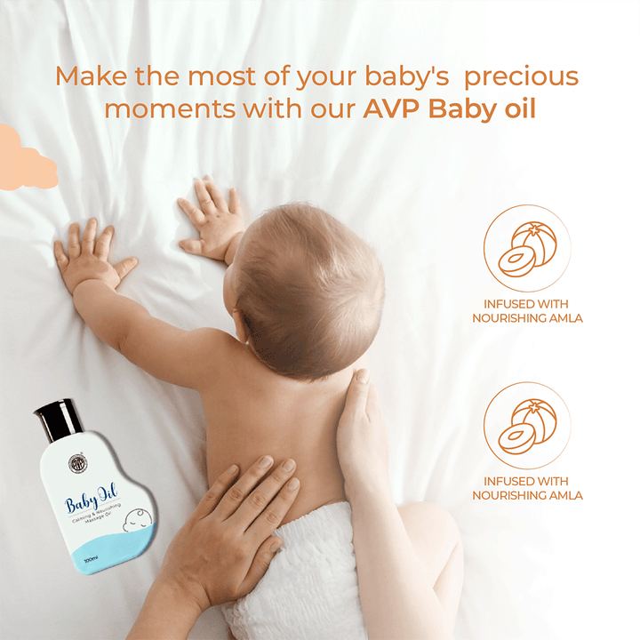 2. Baby Skin Massage Oil - Baby Oil 100 ML: Made with Virgin Coconut Oil, Indian Vetiver, and Ashwagandha | Hypoallergenic and safe for newborns | 100% Natural Ingredients A delicate blend of Ayurvedic ingredients, AVP Baby Oil is crafted to protect and nourish your baby’s sensitive skin. With pure virgin coconut oil, Indian vetiver, and Ashwagandha, this oil provides deep hydration and comfort to your baby’s skin while promoting healthy development.