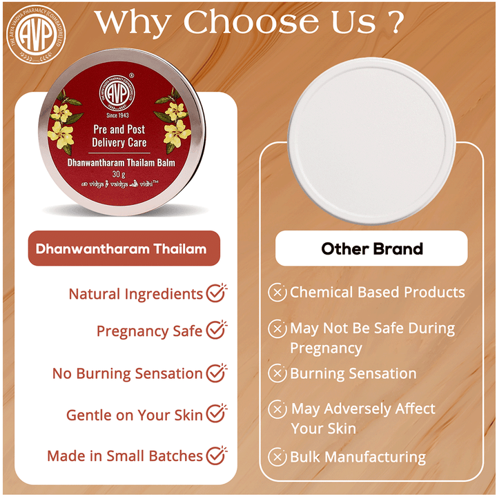 An Ayurvedic recipe passed down through generations! AVP Dhanwantharam Thailam Balm is a comforting Ayurvedic formula, supports an active lifestyle during pregnancy and post delivery, delivering long lasting relief from pains and aches.