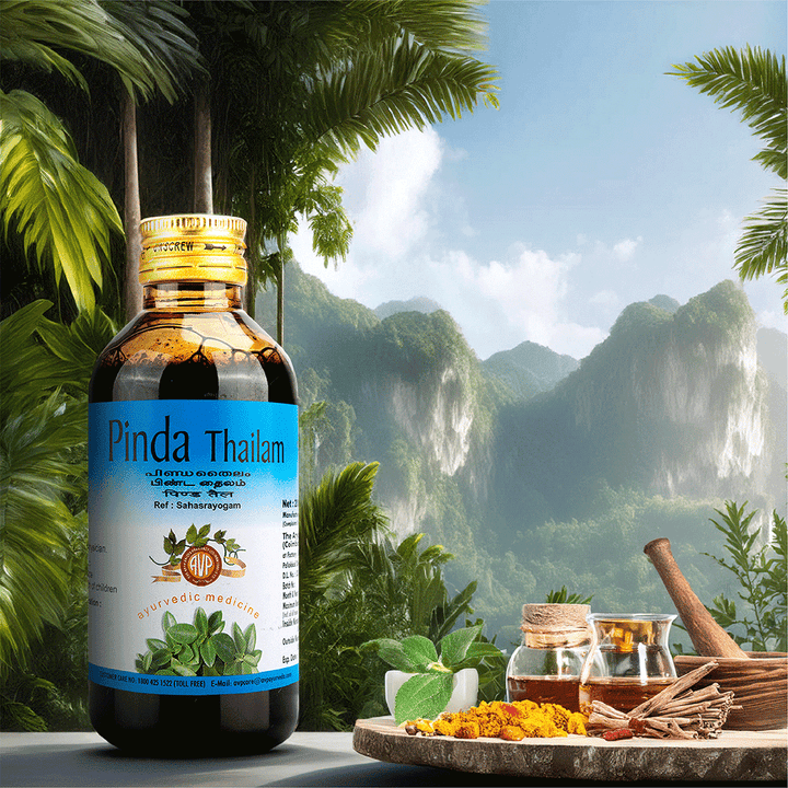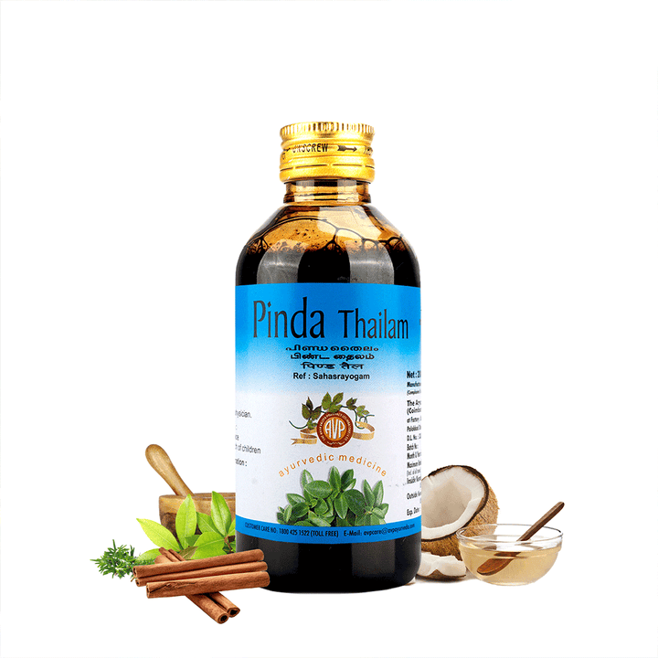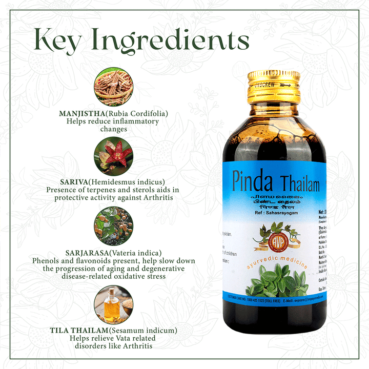 Consistent application of AVP Pinda Thailam aids in maintaining well-nourished and healthy joints, reducing redness, and swelling in the affected areas. The herbs present help reduce inflammatory changes and alleviate burning pain, stiffness, and discomfort in the joints.