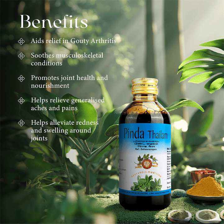 Pinda Thailam by the Arya Vaidya Pharmacy (Coimbatore) Ltd. comprises exquisite ingredients like Manjishta, Sarjarasa and Sariva along with Natural bee wax processed in Tila Thaila. The product helps in managing Gout and other types of Arthritis and aids relief from generalised ache and pain. This herbal oil is an exquisite blend of time-tested ayurvedic herbs, carefully crafted to nurture joint and muscle health thereby contributing to an overall sense of well-being.
